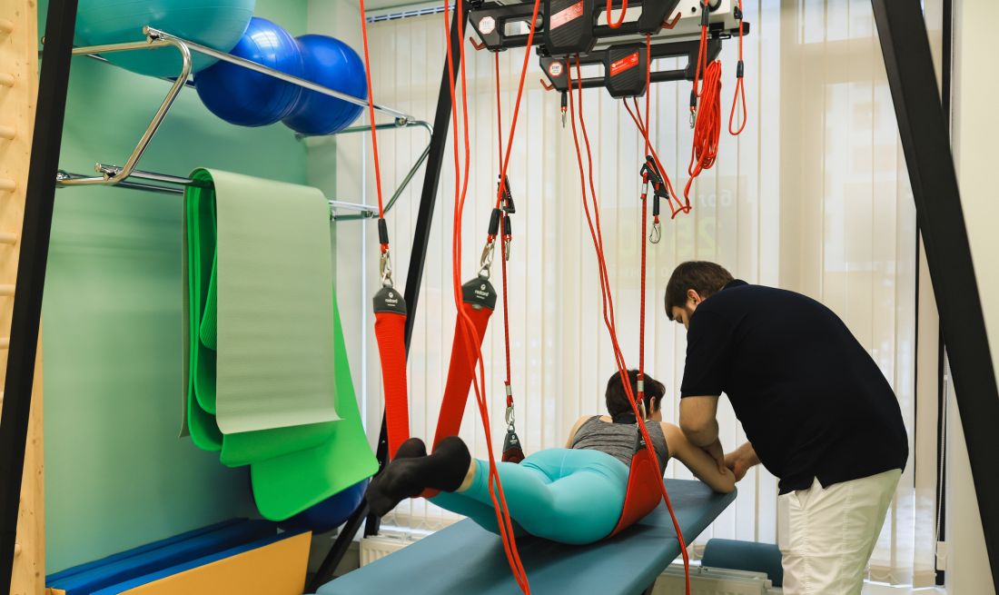 - Разгрузка веса тела. За счет дополнительных эластичных подвесок можно разгрузить вес тела и подобрать упражнение для каждого пациента;